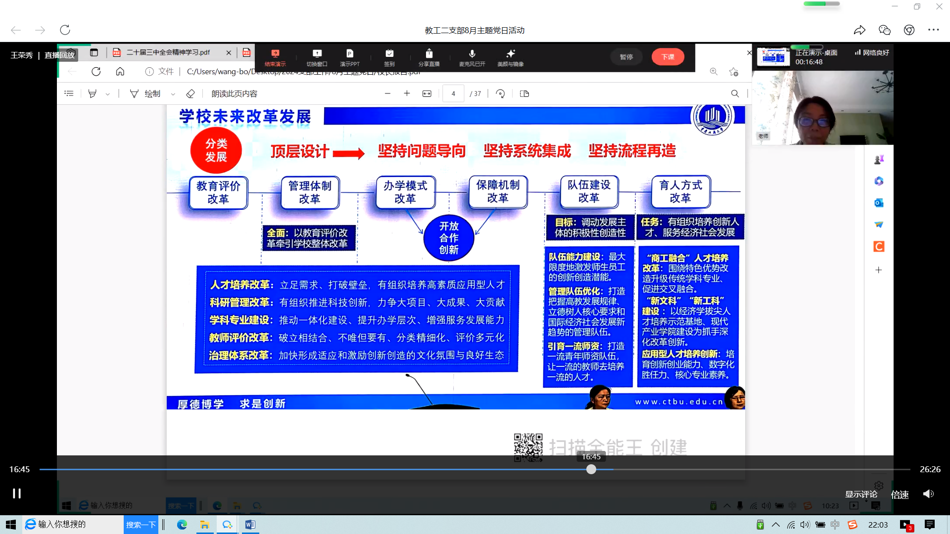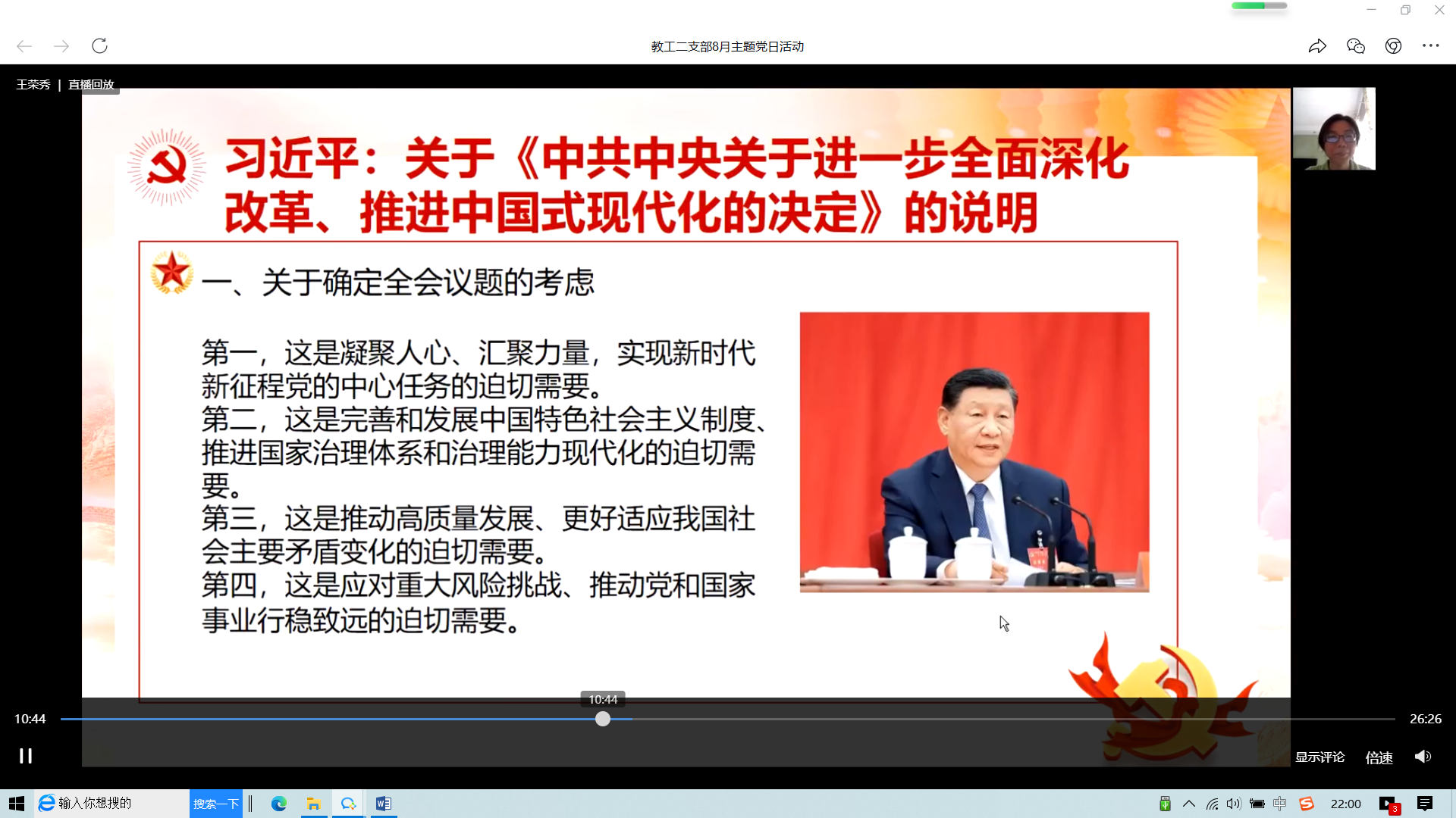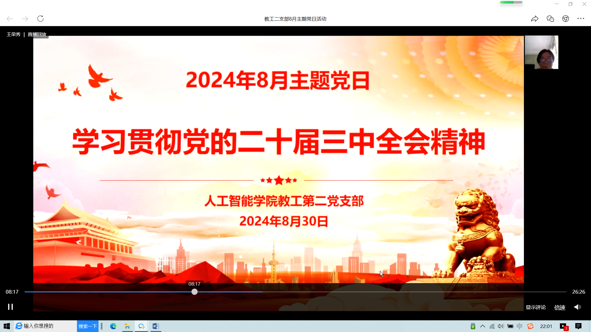 烈日炎炎,开学在即,2024年8月31日上午,2138cc太阳集团教工第二党支部通过企业微信直播课的形式组织了8月主题党日活动。本次活动的主要内容是学习贯彻党的二十届三中全会精神,做好本学期审核评估工作动员,保证开学期间的各项工作顺利进行。