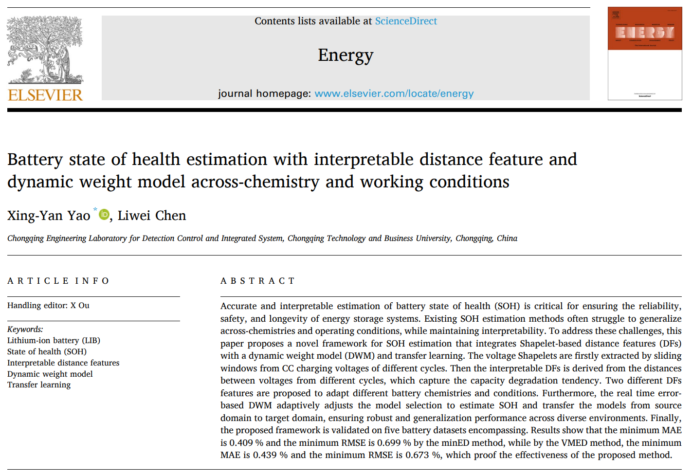 近日,计算机科学与技术专业2022级本科生陈力维(指导老师:姚行艳),在电池健康状态估计研究领域取得了重要进展,相关成果发表在国际顶级能源期刊《Energy》。该研究为电池健康管理技术领域提供了创新理论及应用支撑,并展现了我校在能源低碳及人工智能领域的科研实力,为学科建设及“双碳”战略目标实现注入新动能。