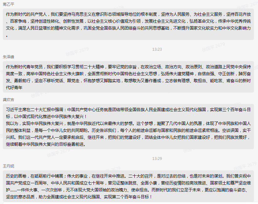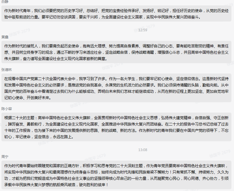 支部学生王丹妮表示:“历史的画卷,在砥砺前行中铺展;伟大的事业,在继往开来中推进。二十大的召开,是对过去的总结,也是对未来的谋划。我们曾庆祝中国共产党成立一百周年、中华人民共和国成立七十周年,曾见证整体脱贫、全面小康,曾经历疫情防控高效推进、国家领土和尊严坚定维护……一件件大事、一次次创举,无不体现大党大国领袖的政治魄力、使命担当。而新时代的我们立足于未来,更应以饱满的奋斗姿态、坚定的意志品质,助力全面建成社会主义现代化强国、实现第二个百年奋斗目标!”
