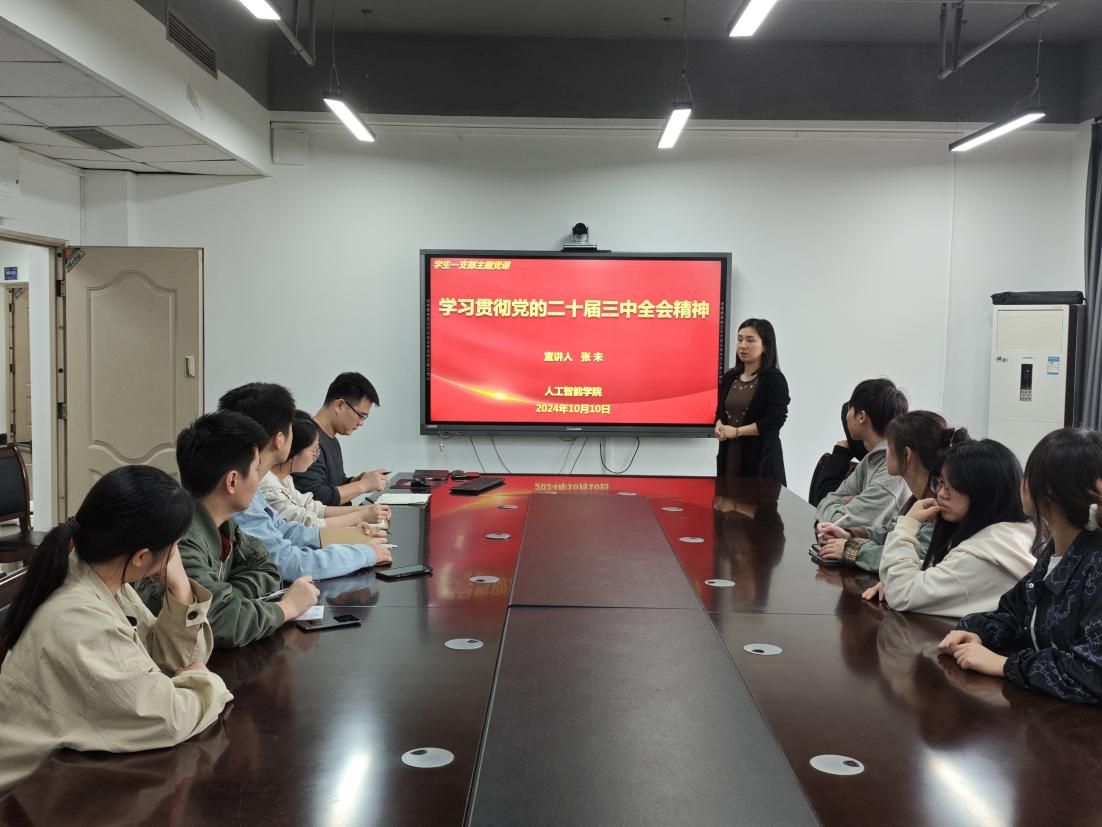 10月20日中午,学院党委副书记张未在慧智楼90810会议室为学生第一党支部全体党员宣讲党的二十届三中全会精神,会议由支部书记徐国平主持。