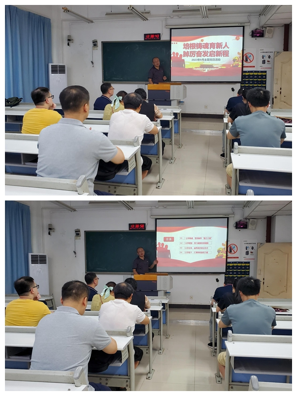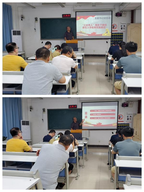 在主题党日活动之后,教工二支部进行了“支部书记讲党课”活动。支部书记李明同志结合刚刚结束的新生入学教育活动,以“三全育人理念下高校新生入学教育实施路径”为题为支部党员讲党课。李明从“三全育人”理念融入高校新生入学教育的必要性,高校新生入学教育现状,以及“三全育人”理念下高校新生入学教育实施路径三个方面进行了深入了讲解。李明最后指出,新生入学教育是构建现代化教育体系的重要基础,是开展大学生思想政治教育的重要环节;必须坚持“三全育人”理念,丰富教育内容和形式,使新生入学教育工作真正成为高校后续一切教育工作的基石。